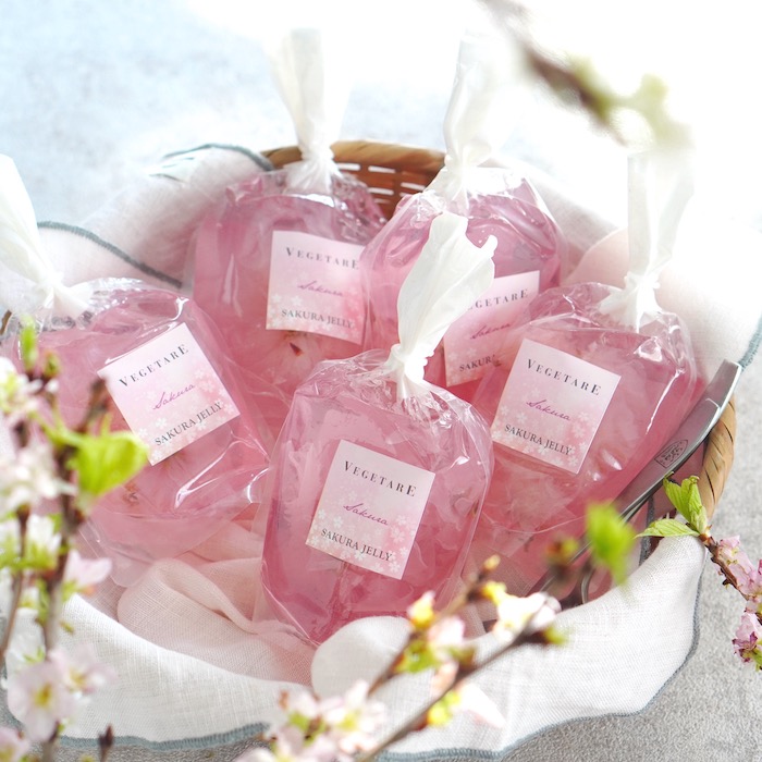 ぷるるん、つるるん食感の桜色のゼリーのなかで可憐に桜が咲くベジターレの「桜ゼリー」は見た目にも美しく、ご挨拶、お返し、卒業や退職・異動、入学のお祝いのプレゼントとして毎年好評をいただいています。