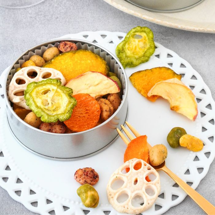 ペペロンチーノの落花生豆菓子、そしてわさび、枝豆、梅しそ、黒胡椒、カレーの5種のそら豆菓子に、人参、ゴーヤ、りんご、かぼちゃ、れんこんの野菜&果物チップスが缶の中に入っています。