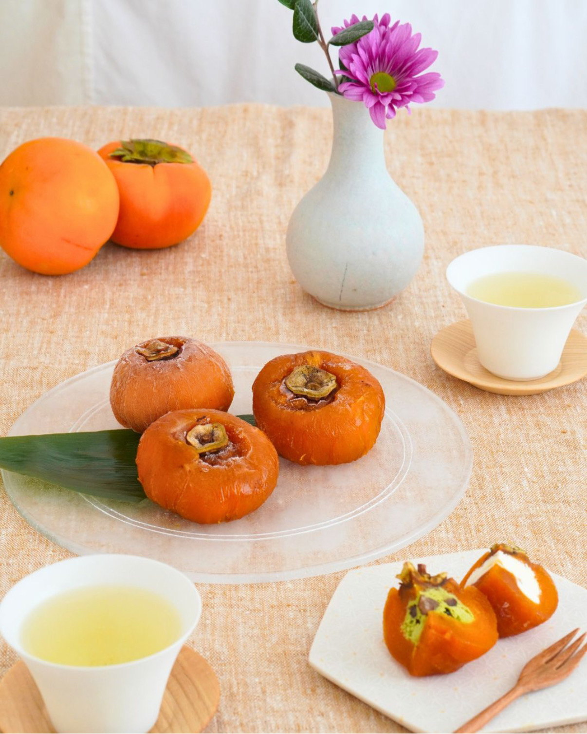抹茶のほろ苦さと、あんぽ柿の濃密な甘さが重なり、落ち着きのある味わいに仕上がっています。