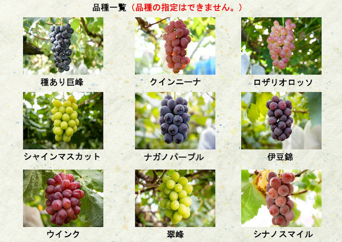 巨峰、シャインマスカット、ナガノパープル、ロザリオロッソなどの4〜8種類の品種が入っています。